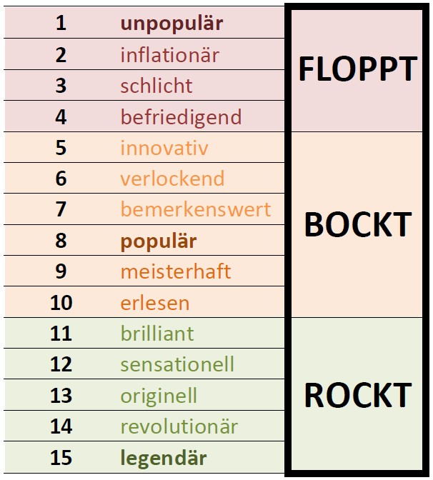 Innerhalb der dreiklassigen Bewertungsskala bekommt jeder Punktzahl auch noch eine 1-Wort-Bewertung. Diese reicht von unpopulär bis legendär und spiegelt alle Punktzahl-Stände wieder von 1 bis maximal 15 Punkten.