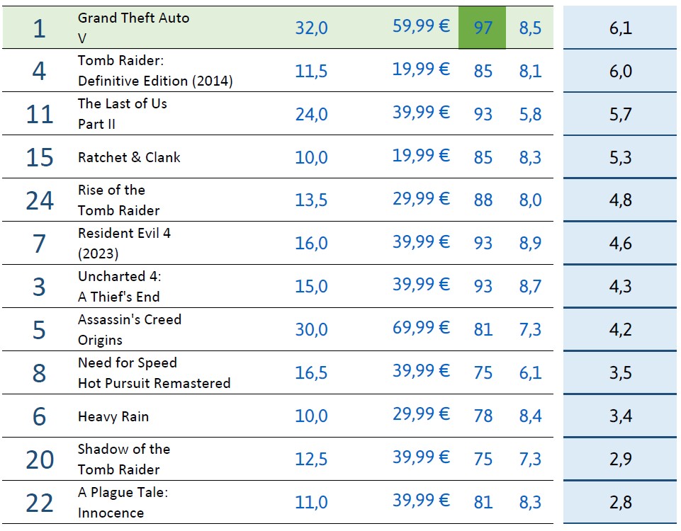 Im üblichen preislichen mittleren-unteren Mittelfeld mit einem Standardpreis von € 39,99 sind dann von Resident Evil 4 (2023) über A Plague Tale: Innocence und Uncharted: The Lost Legacy bis hin zu The Order: 1886 zu finden. Grand Theft Auto V führt solide die mittlere Tabelle an, weil es sich durch eine kürzere Spielzeit bei gleichem Preis wie Red Dead Redemption 2 mit einem PFI von 6,1 zufriedengeben muss. Diese beiden Titel belegen aber nun nicht die unteresten Plätze was nach der alten Berechnung ziemlich unlogisch war.