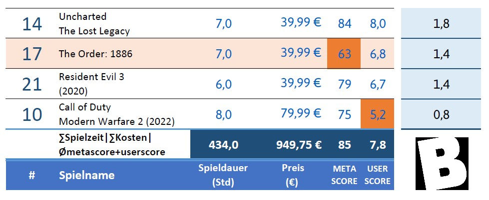 Den Abschluss bilden dann die Kracher Red Dead Redemption 2, Grand Theft Auto V, Assassin’s Creed Origins und Odyssey, sowie das völlig überteurte Call of Duty Modern Warfare 2 (2022). Den letzten Platz belegt immer die Neuauflage von Call of Duty Modern Warfare 2 egal wie ich es berechne und welchen Bewertungsansatz ich wähle. Das würde mir als Entwickler zu denken geben, denn gerade mal 8 Stunden Spielzeit bei exorbitanten € 79,99 Höchstpreis haben die Community das Spiel einfach schlecht bewerten lassen. Davor liegen dann nur noch Resident Evil 3 (2020), The Order: 1886 und Uncharted: The Lost Legacy weil die Spiele mittlere bis gute Kritiken erhielten, mit einer Spielzeit von unter 10 Stunden einfach etwas zu kurz geraten sind und der Standardpreis von € 39,99 wohl etwas überhöht ist momentan.