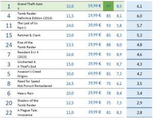 Die Liste führt Red Dead Redemption 2 an obwohl es im oberen Preissegment zwischen 59,99 € – 79,99 € einzuordnen ist. Die extrem gute Bewertung gepaart mit der langen Spielzeit von 50,5 Stunden für die Hauptstory bringen die Platin-Spitzenposition. Auf den weiteren Trophäen-Plätzen befindet sich The Last of Us Remastered, Uncharted 2: Among Thieves Remastered und God of War (2018). Gegen diese Neuordnung ist logischerweise auch nichts einzuwenden, denn alle 4 Titel sind extrem erfolgreiche Tripple-A Produktionen.