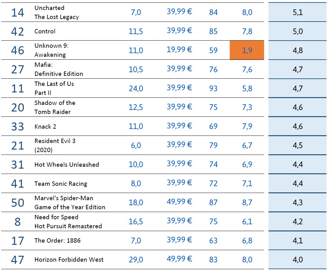 Aber langer Rede kurzer Sinn, hier ist die Preis-Spass-Index Auswertung meiner persönlichen Top50 Spiele für die PS4: