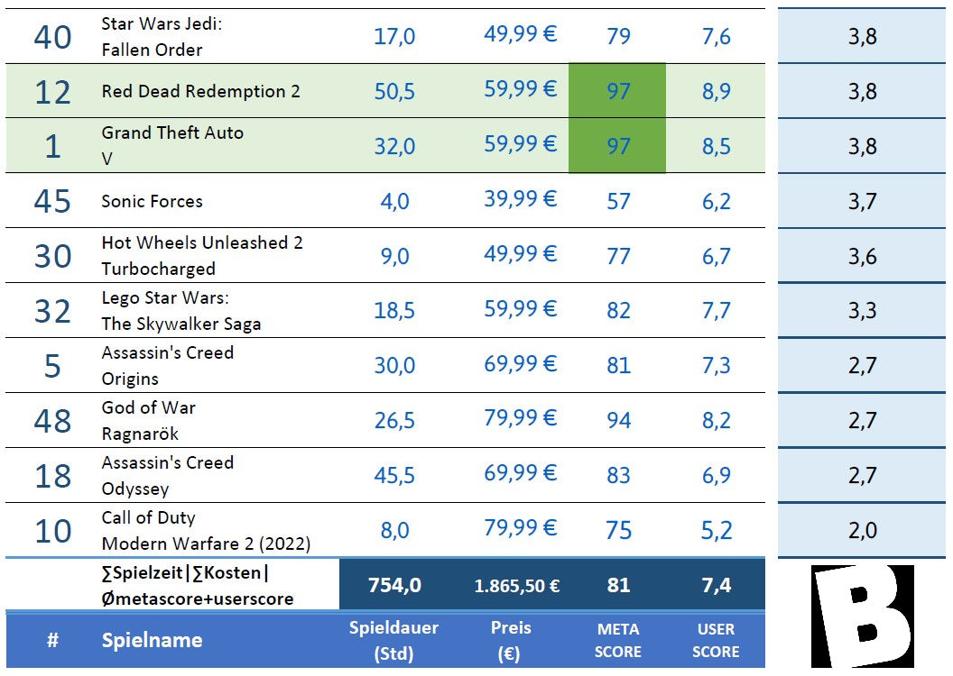 Im untersten Viertel der Liste landen wegen dem hohen Preis bei hoher Spielzeit und hoher Bewertung dann die Kracher Red Dead Redemption 2 und Grand Theft Auto V. Schlusslicht ist weiterhin Call of Duty Modern Warfare 2 aus dem Jahre 2022.