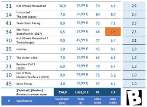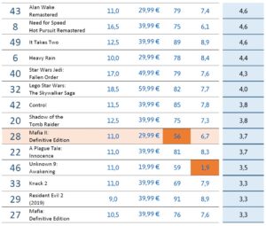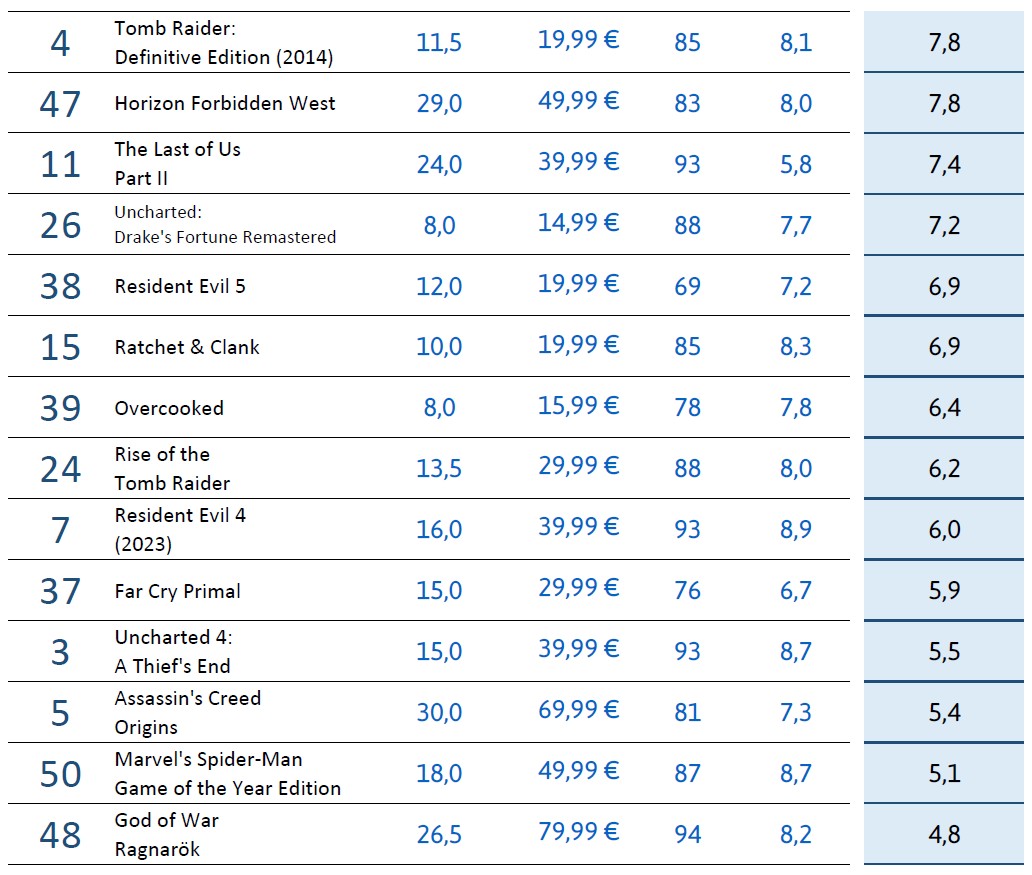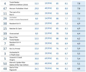 Im dicken Mittelfeld mit PFI-Punkten zwischen 10,6 7,8 und 4,0 finden sich mittelpreisige Spiele aller Preisklassen zwischen 20-70 Euro. So landen hier auch extreme Kracher wie Resident Evil 4 Remake und Uncharted 4, die eine hohe Bewertung haben aber auch mehr als 10 Stunden dauern. Auch das am Schlechtesten bewertete Spiel Mafia II: Definitive Edition findet sich hier wieder mit der gleichen Punktzahl in Höhe von 5,1 wie A Plague Tale: Innocence und Uncharted: The Lost Legacy. Ebenfalls in diesem oberen Mittelfeld reihen sich Knaller-Titel wie The Last of Us Part II, Ratchet & Clank, Assassin’s Creed Origins und It Takes Two ein.