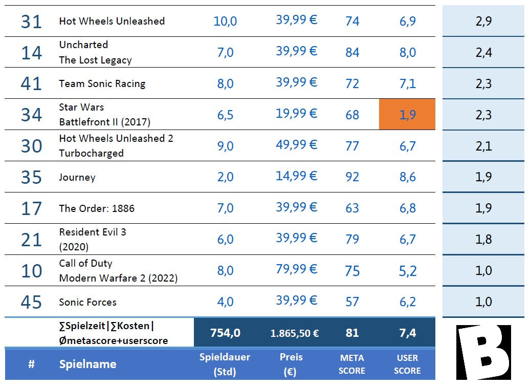 Im untersten Viertel der Liste landen wegen dem hohen Preis bei hoher Spielzeit und hoher Bewertung dann die Kracher Red Dead Redemption 2 und Grand Theft Auto V. Schlusslicht ist weiterhin Call of Duty Modern Warfare 2 aus dem Jahre 2022. Der einzige Trost für Call of Duty MW 2 ist dass sich Sonic Forces zu ihm gesellt und sie den letzten Platz mit einem PFI von 1,0 teilen. Ich finde durchaus zurecht aus den bereits genannten Gründen. In diesem untersten Viertel finden sich dann aber auch gute Spiele wie Uncharted: The Lost Legacy und Journey einfach weil sie zu kurz ausfallen.