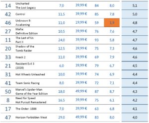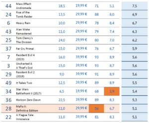 Im dicken Mittelfeld mit PFI-Punkten zwischen 10,6 und 4,0 finden sich mittelpreisige Spiele zwischen 20-50 Euro. So landen hier auch extreme Kracher wie Resident Evil 4 Remake und Uncharted 4, die eine hohe Bewertung haben aber auch mehr als 10 Stunden dauern. Auch das am Schlechtesten bewertete Spiel Mafia II: Definitive Edition findet sich hier wieder mit der gleichen Punktzahl in Höhe von 5,1 wie A Plague Tale: Innocence und Uncharted: The Lost Legacy.
